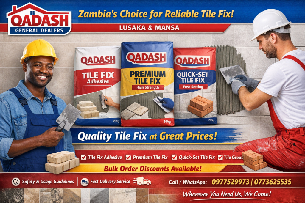 QADASH GENERAL DEALERS does not only supply strong and reliable Tile Fix โ we also have skilled experts who professionally fix tiles anywhere they are needed! From homes to apartments and commercial buildings, we guarantee a clean, durable, and beautiful finish every time. We proudly serve Lusaka and Mansa with competitive prices and fast response.